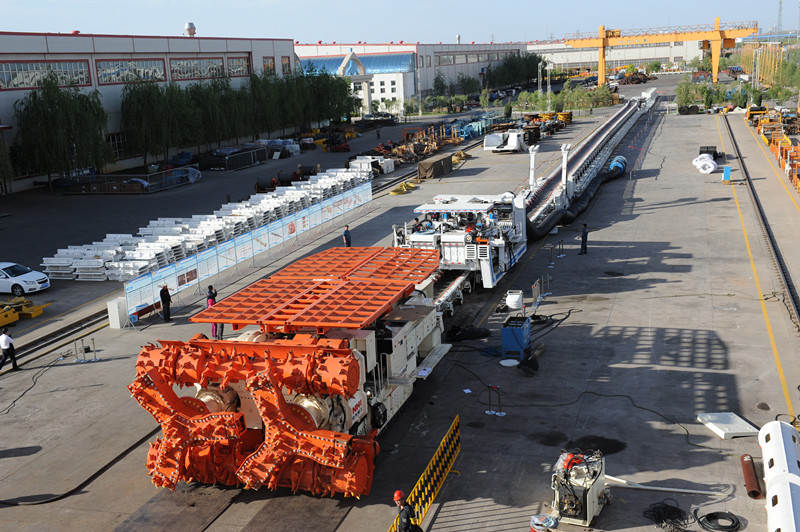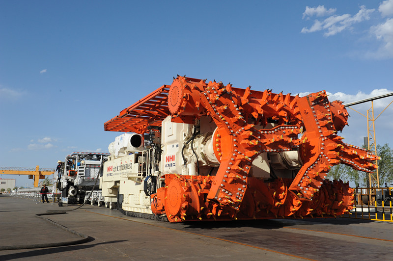 Based on the international advanced technology,NHI successfully developed the full-section coal road high efficiency boring machine_QMJ4260.The machine has multifunction of full-section, continuous cutting technology, automatic positioning, wireless remote control technology, fast loading and shipping, dust removing, airborne Roofbolter and shunting. It achieves coal road fast driving, long-distance remote control operation and significantly improves driving efficiency. With over 3000m footage per month, QMJ4260 boring machine achieves another technological leapfrogging in the field of coal driving.